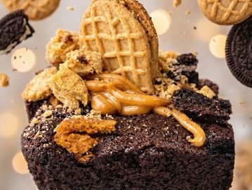 Decadent brownie layered with crushed Oreos, crushed Nutter Butter cookies and drizzled with Peanut butter