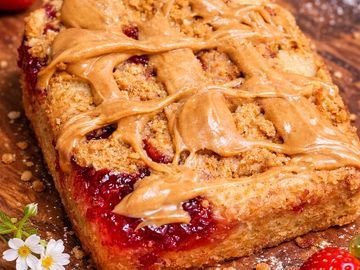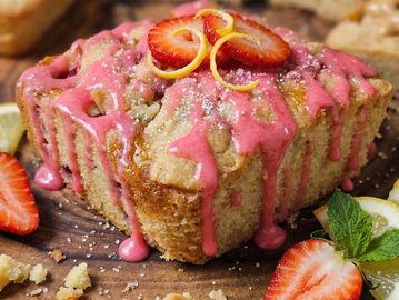 Lemon blondie swirled with tangy lemon curd and topped with strawberry glaze.