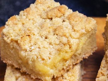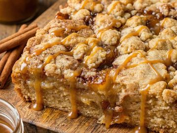 Golden blondie with tender apple chunks, cinnamon spice, crunchy vanilla crumble finished with caramel drizz.
