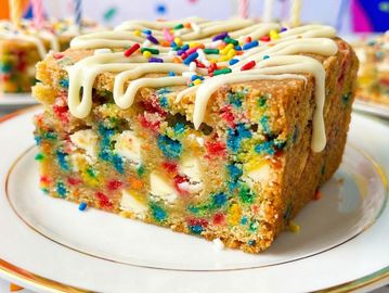 Buttery blondie loaded with white chocolate chunks, sprinkles, and drizzled with vanilla